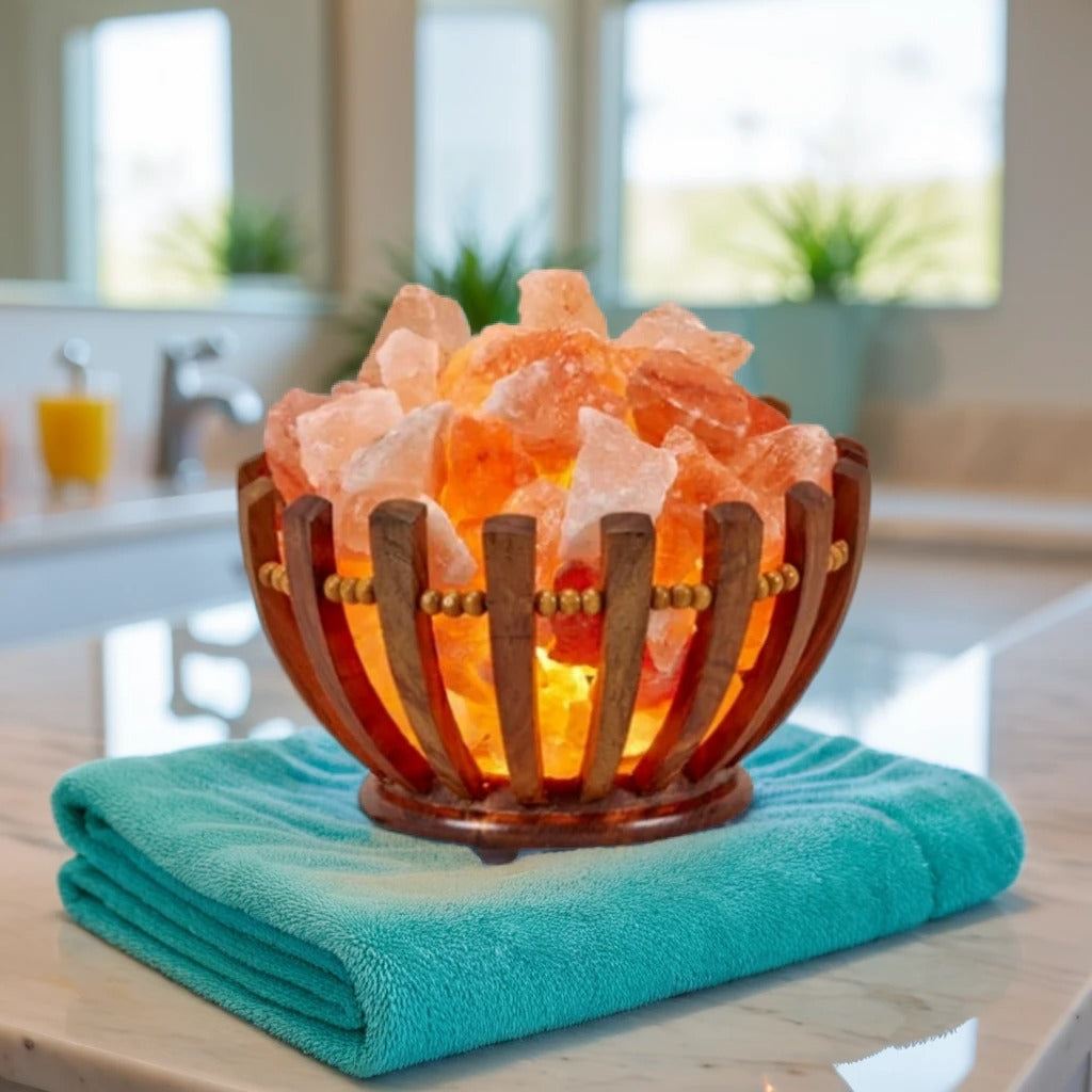 This stunning lamp features generous chunks of pink Himalayan salt nestled in a handwoven neem wood bowl, creating a harmonious blend of organic textures and warm illumination. The open basket design allows the salt's natural glow to radiate in all directions, casting a soothing amber light that enhances any space.