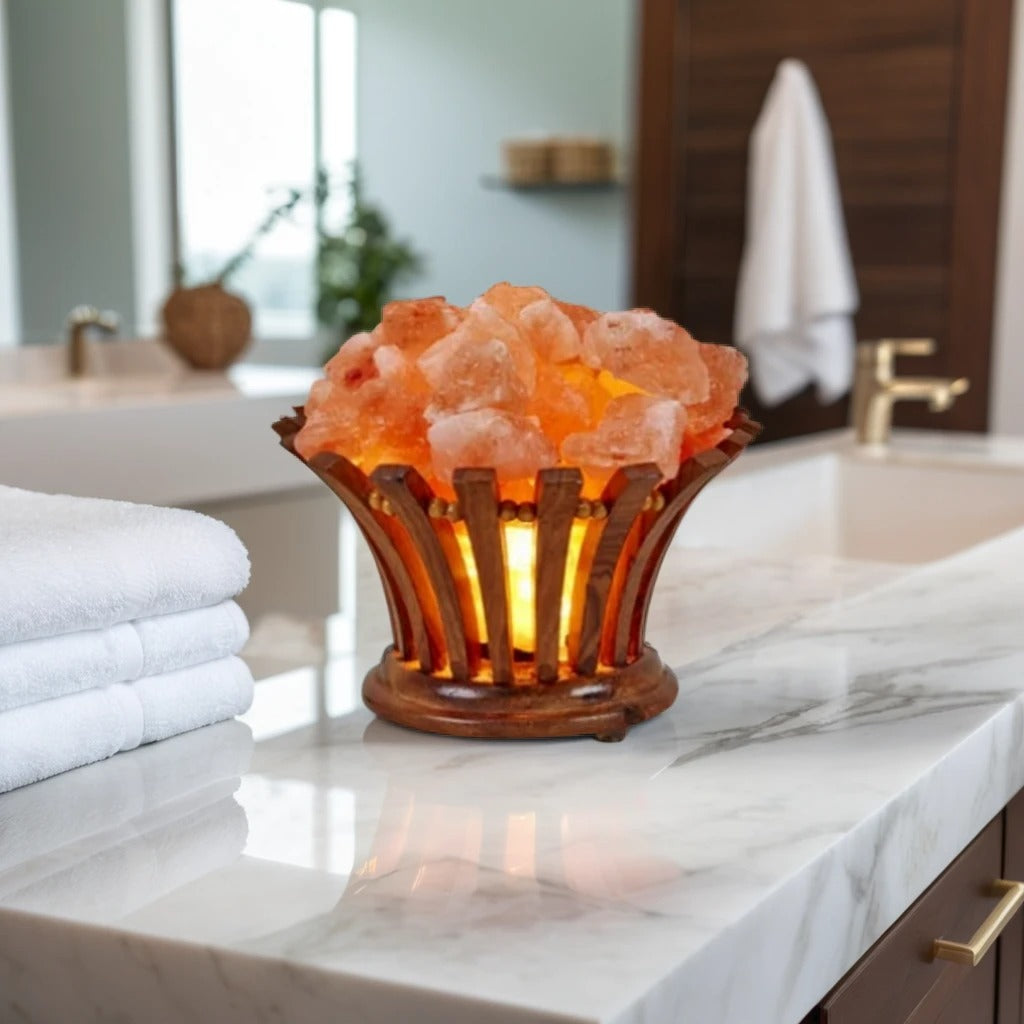 This exquisite lamp features radiant pink salt crystals cradled within a hand-carved floral wooden basket, creating a harmonious blend of organic beauty and warm ambient lighting. The intricate petal-shaped design diffuses a soft amber glow, transforming any space into a serene sanctuary.